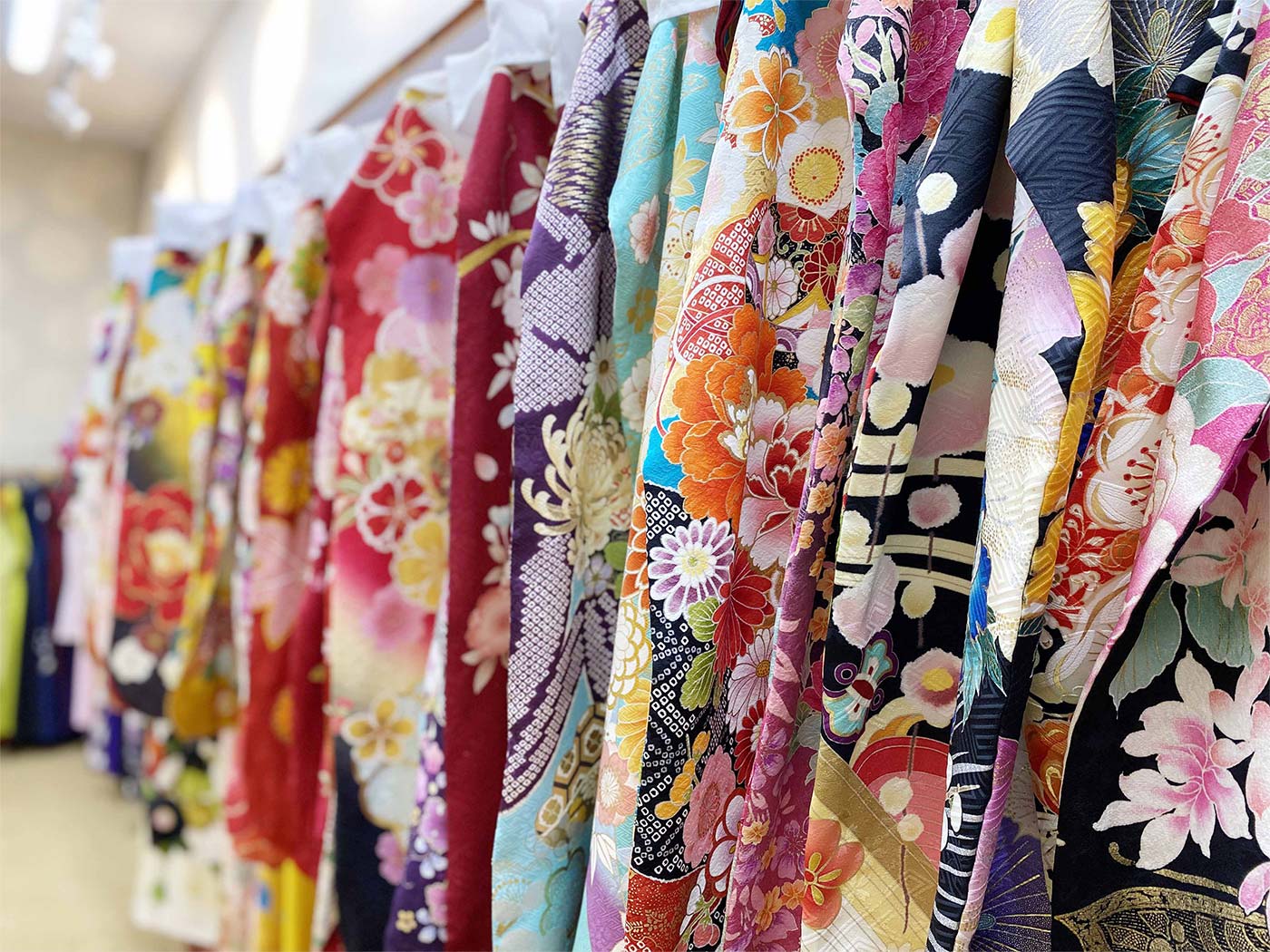 古典柄から最新デザインまで、150着以上の中から選べる振袖&卒業袴の展示ギャラリー。草履やバッグ、着付け小物のコーディネイトもお任せください。